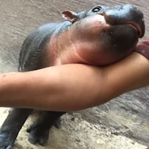 Adorable Baby Hippo Nuzzles Zoo Keeper