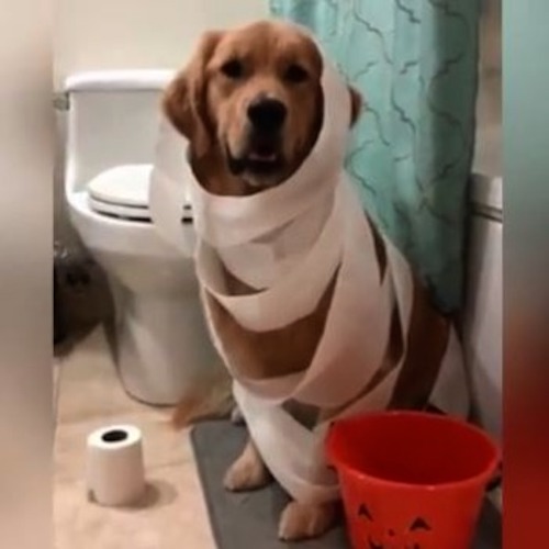 Cute Dog Dresses Up as Toilet Paper Ghost