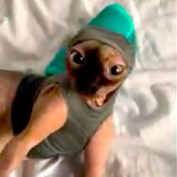 Hairless Cat Befuddled by DYI Sock Hoodie